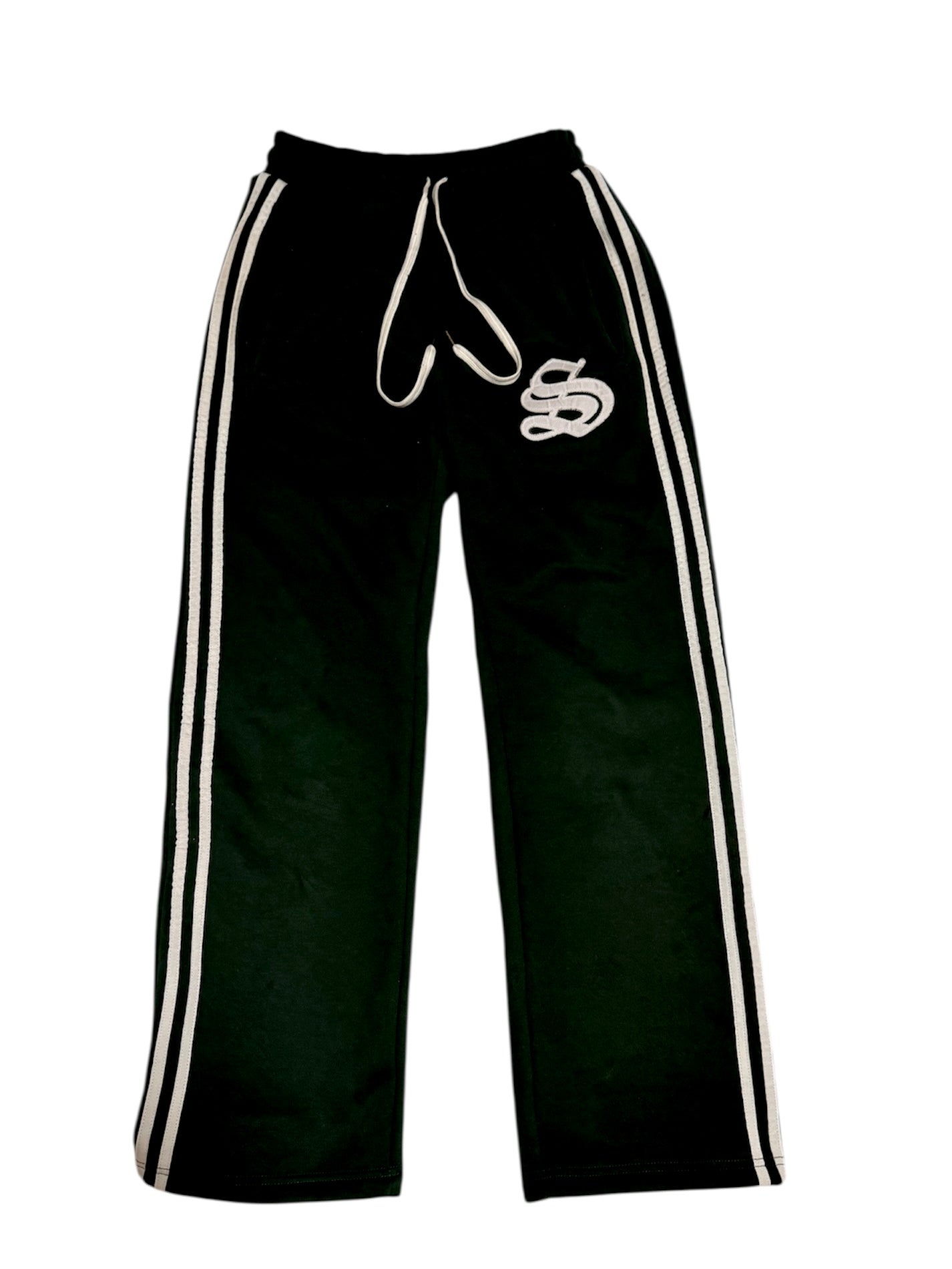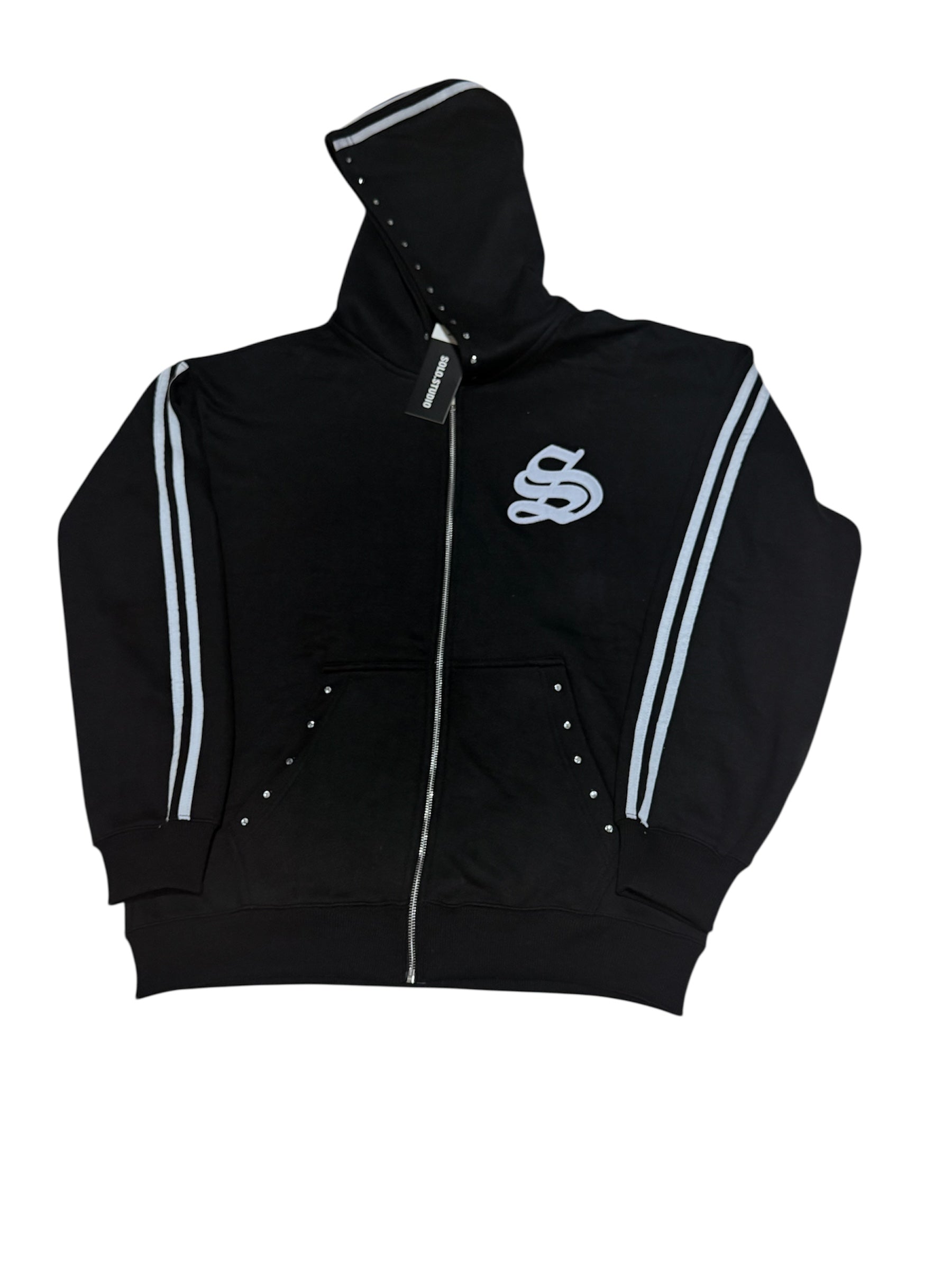 Clean, bold, and built for the streets. This black sweatsuit features sharp zipper detailing, subtle rhinestone accents, and contrast sleeve striping for a standout look.